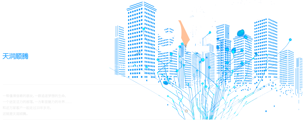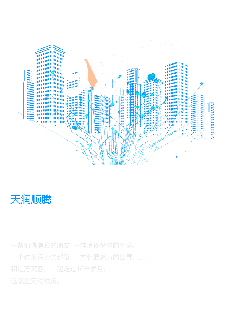 一幫值得信賴的朋友,一群追逐夢(mèng)想的生命, 一個(gè)迸發(fā)活力的部落,一方彰顯魅力的世界…… 和近萬(wàn)家客戶一起走過(guò)10年歲月, 這就是天潤(rùn)順騰。